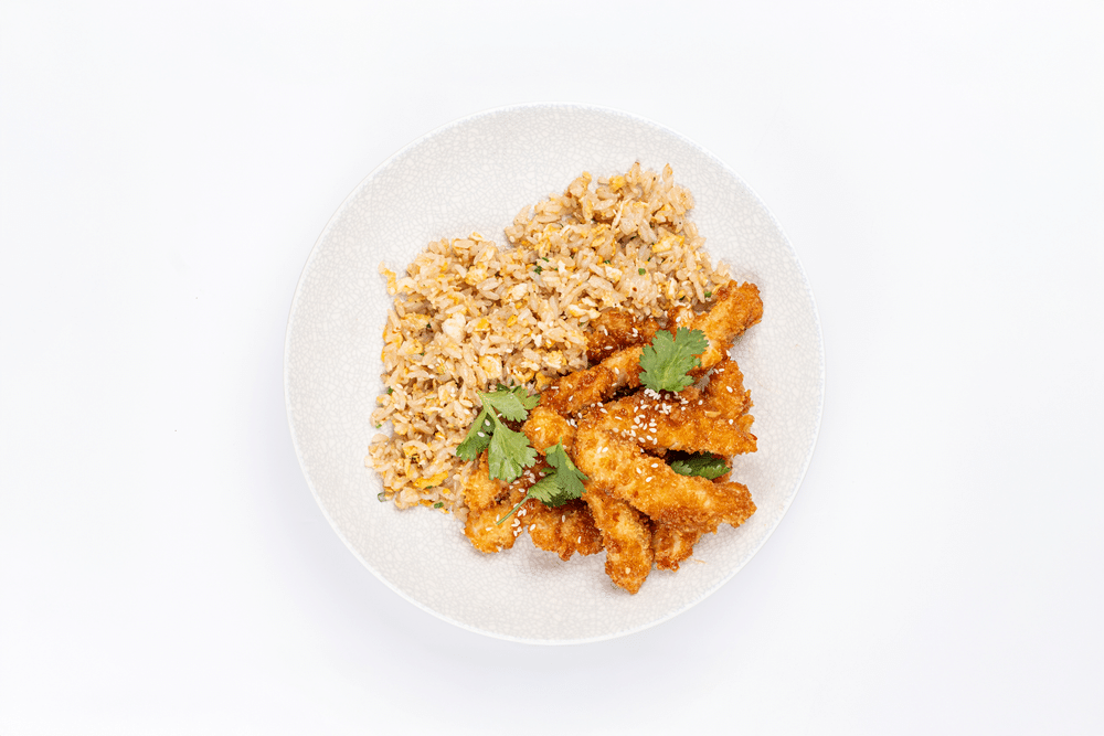 Рис, обжаренная с яйцом, куриная грудка темпура, в соусе кисло-сладкий. украшается кинзой