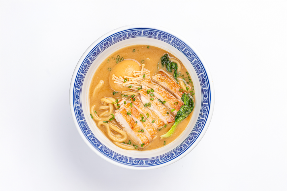 Бульон пайтан, лапша рамен, салат бок чой , грибы эноки, яйцо аджитамого, куриное бедро су вид, зеленый лук