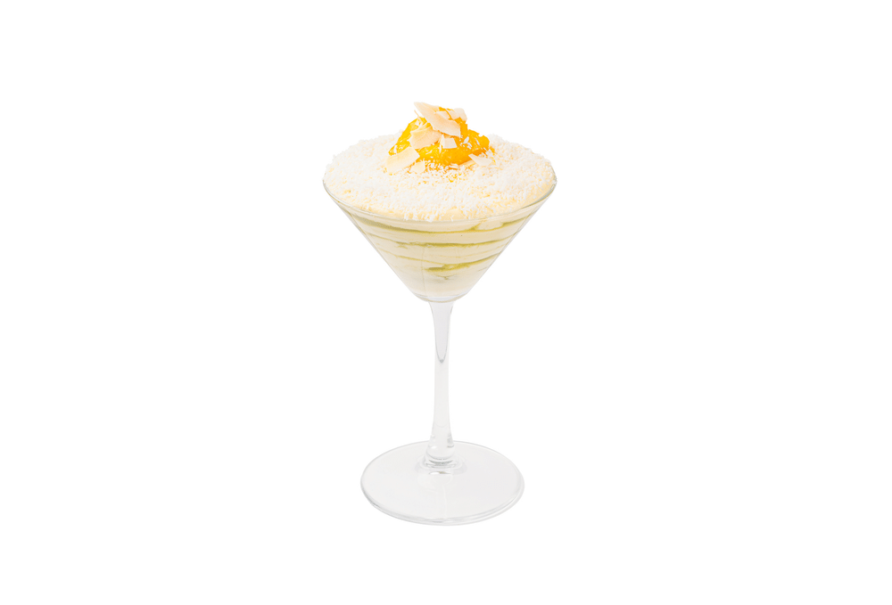 Печенье савоярди, пропитка кокос матча, кокосовый крем тирамису, кокосовая стружка. манго в соусе юдзу, кокосовые чипсы