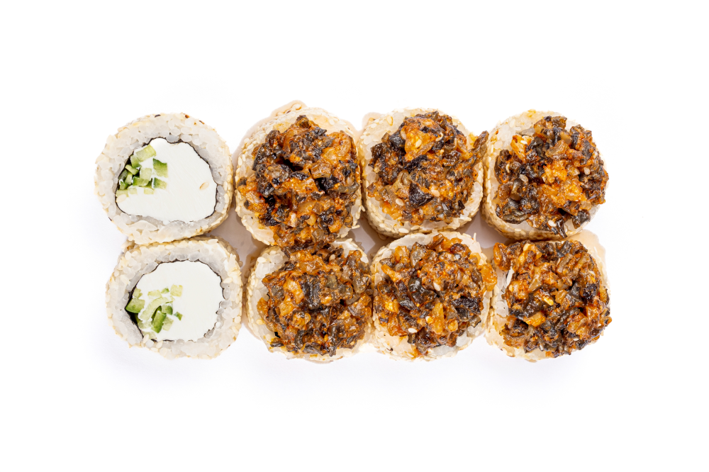 Копченый угорь, сыр cremette, огурец, яки соус и спайси соус (слегка острый) (1 порция = 8 шт.)