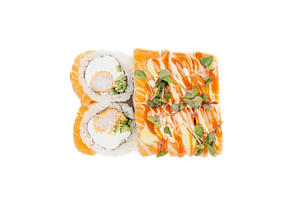Рис, нори, сливочный сыр, огурец, креветка тигровая темпура, лосось. соуса: имбирно манговый, унаги (1 порция = 8 шт.)