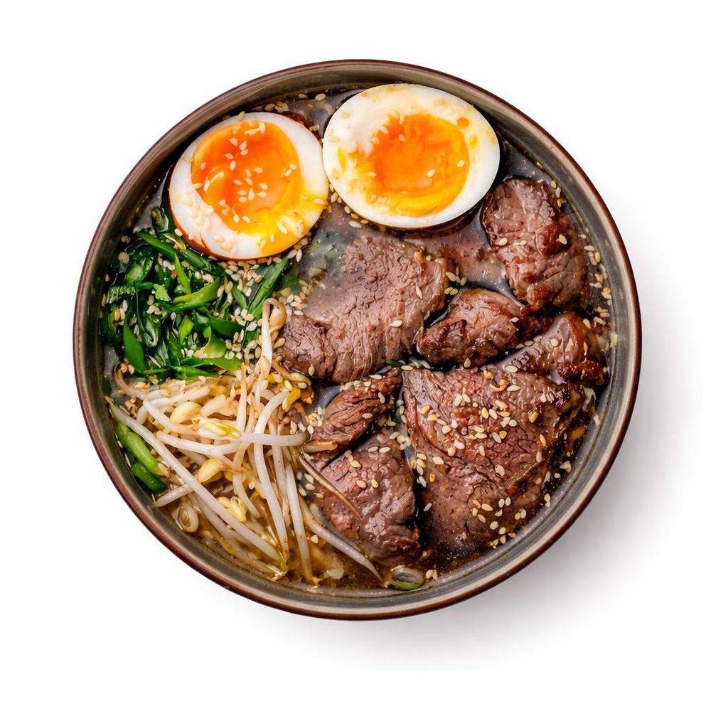 Мясной бульон, грудинка говяжья, лапша, ростки сои, маринованное яйцо, зелёный лук.
