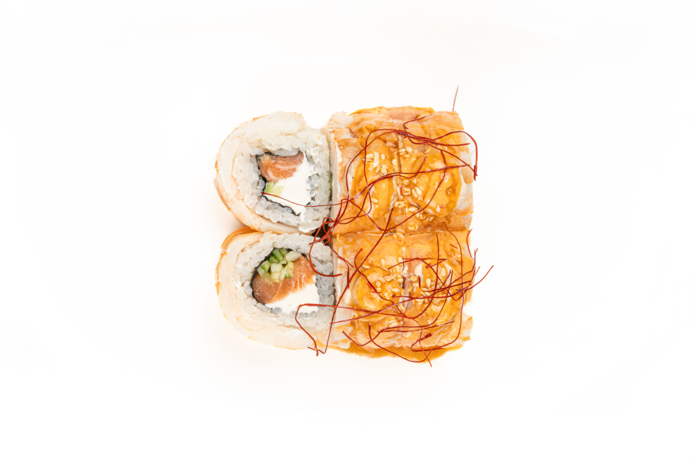 Рис, нори, сливочный сыр, огурец, лосось, креветки тигровые, унаги чиз, соус том ям, соус терияки, нити чили, жареный арахис