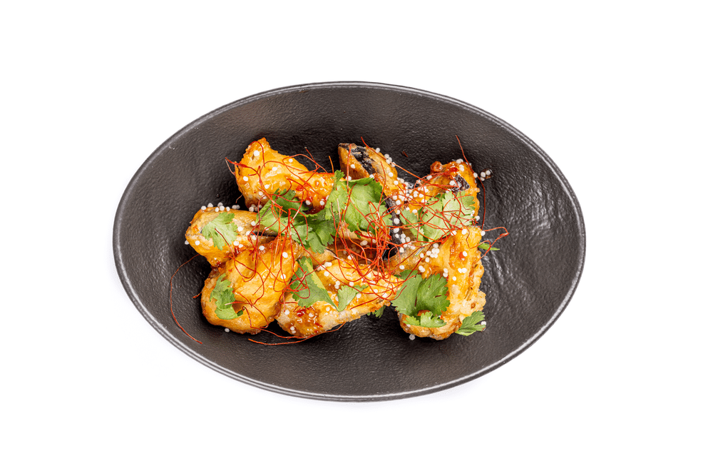 Баклажан,картофельный крахмал, темпура, соус сладкий чили юдзу, воздушный рис, кинза, нити чили