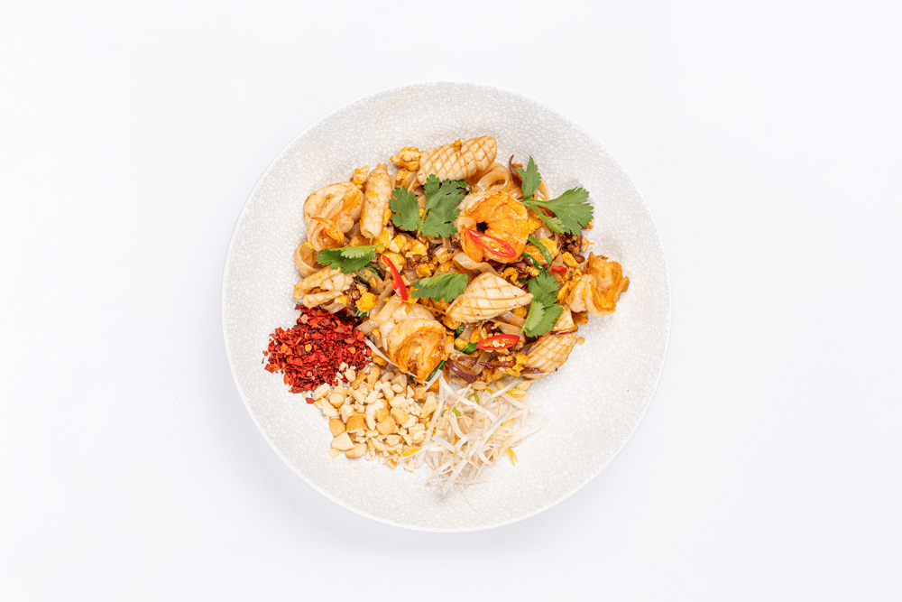 Лапша рисовая, креветки тигровые, кальмары, красный лук, яйцо, соус пад тай. ростки сои, чили хлопья, кешью. украшается кинзай и чили перцем