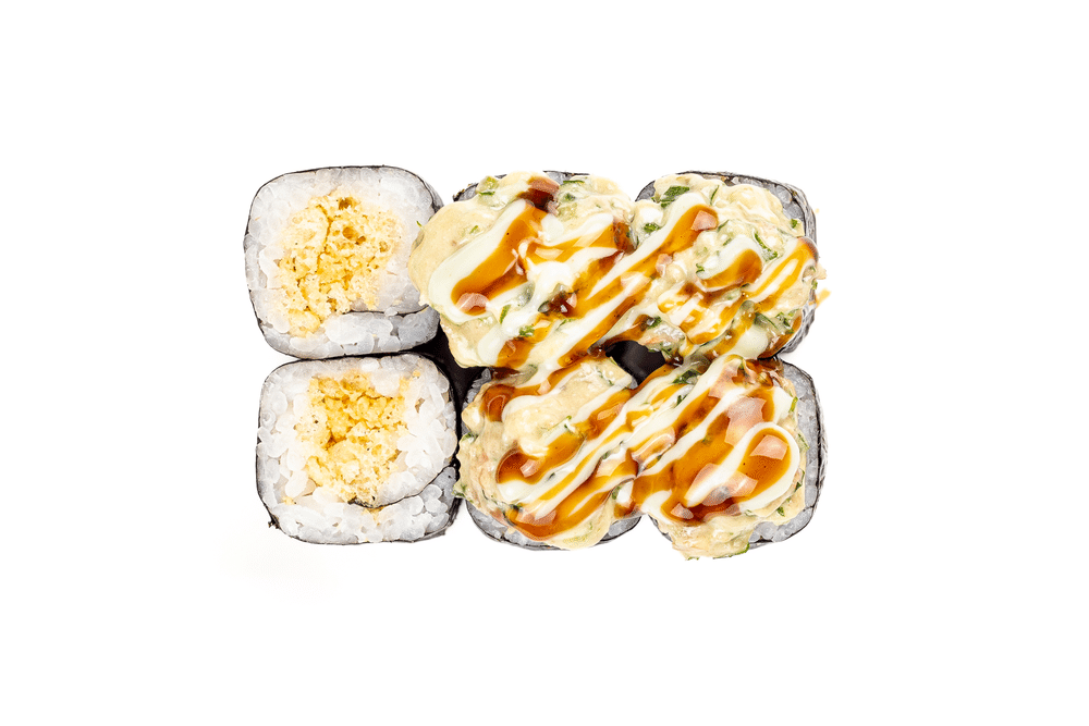 Рис, нори, хрустящий кляр, шапка: огурец, авокадо, креветка, руккола в сливочном соусе. поливается васаби и унаги соусом