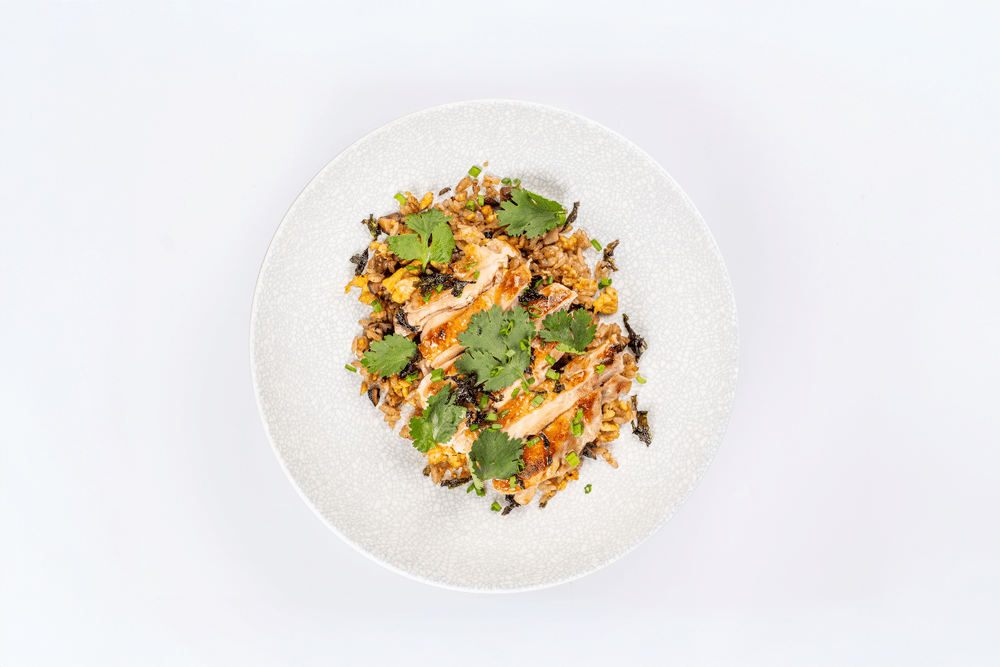 Рис, грибы шиитаке, яйцо куриное ,имбирь, чеснок, соевый соус, кунжутное масло, куриное бедро су вид, соус унаги, хлопья нори, зеленый лук , кинза
