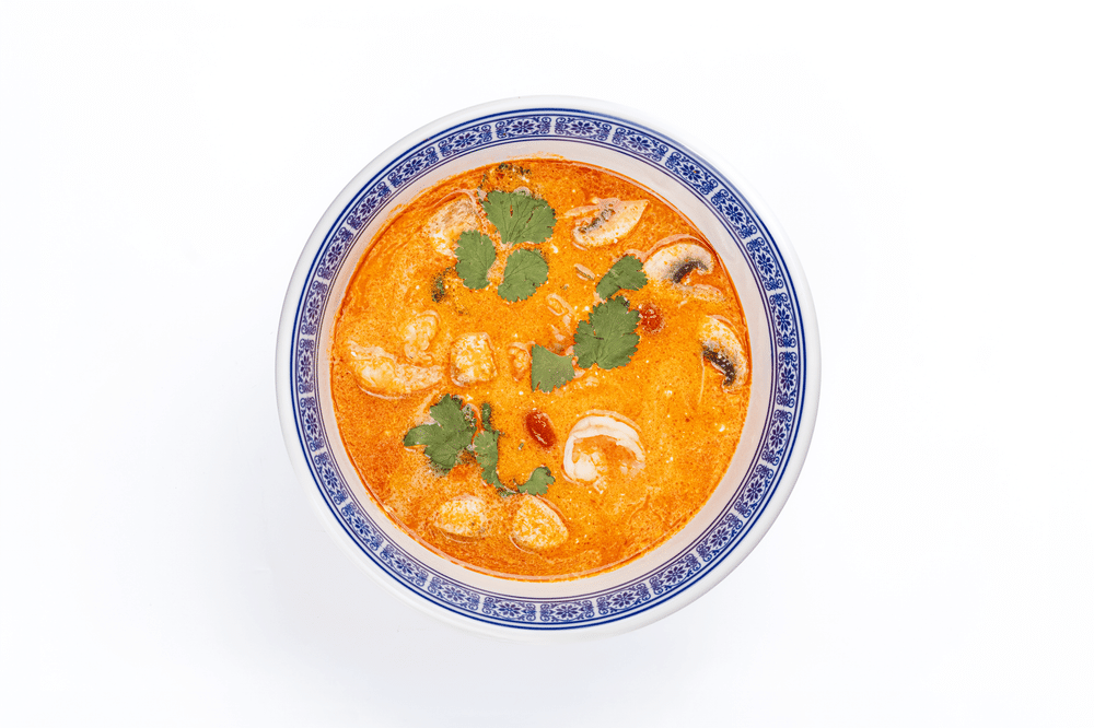 Традиционный тайский суп с ярким, остро-кислым вкусом: насыщенный бульон с нотками лимонной травы, галангала и лайма, креветками, шампиньонами. Каждый глоток согревающий и бодрящий одновременно.