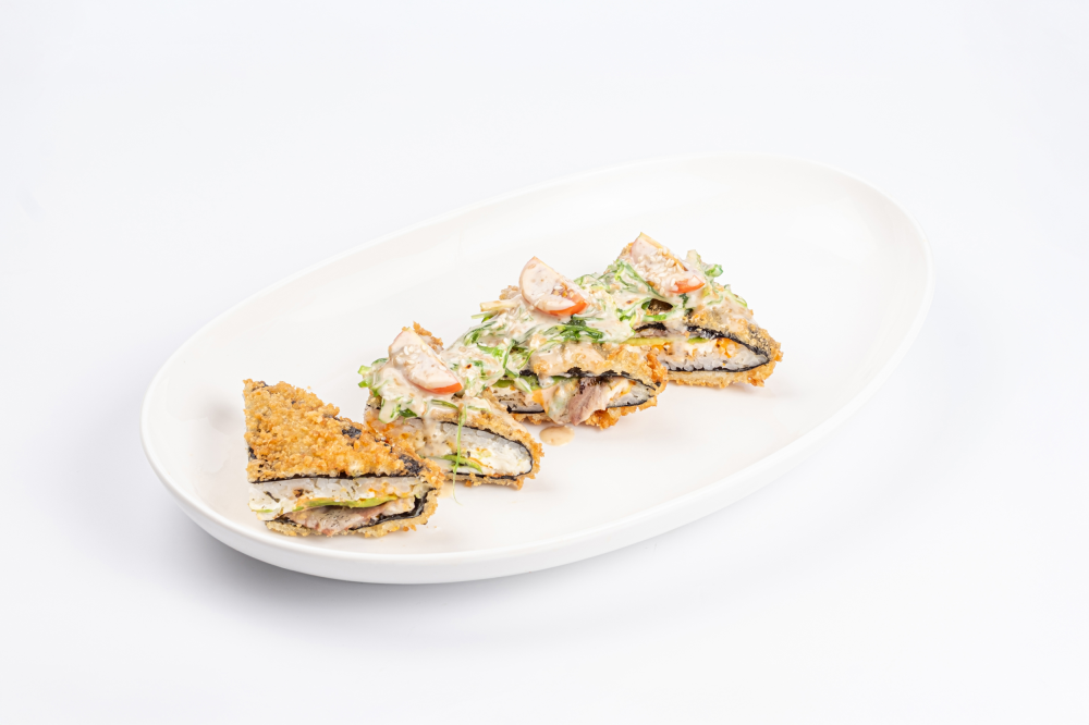 Рис, нори, сливочный сыр, копченый угорь, авокадо, сверху салат чука, ореховый соус, томаты черри и кунжут (1 порция = 4 шт.)