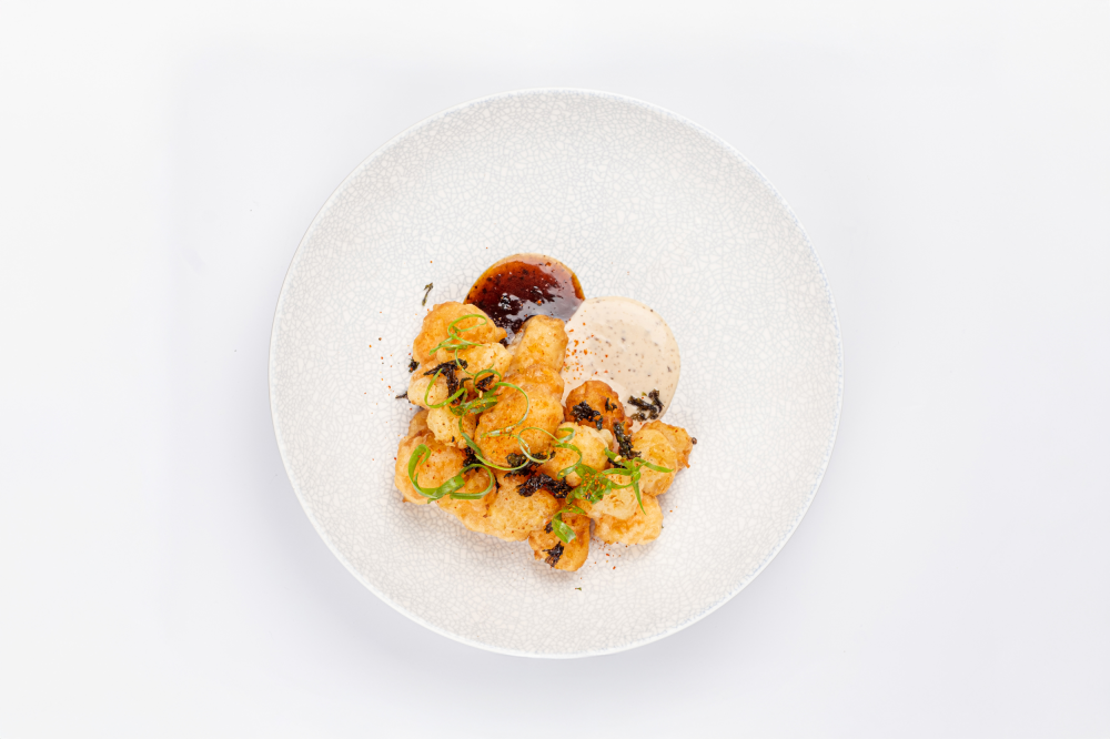 Креветки тигровые, гребешок, крахмал, темпура, нори, соус трюфельный терияки, соус трюфельный майо