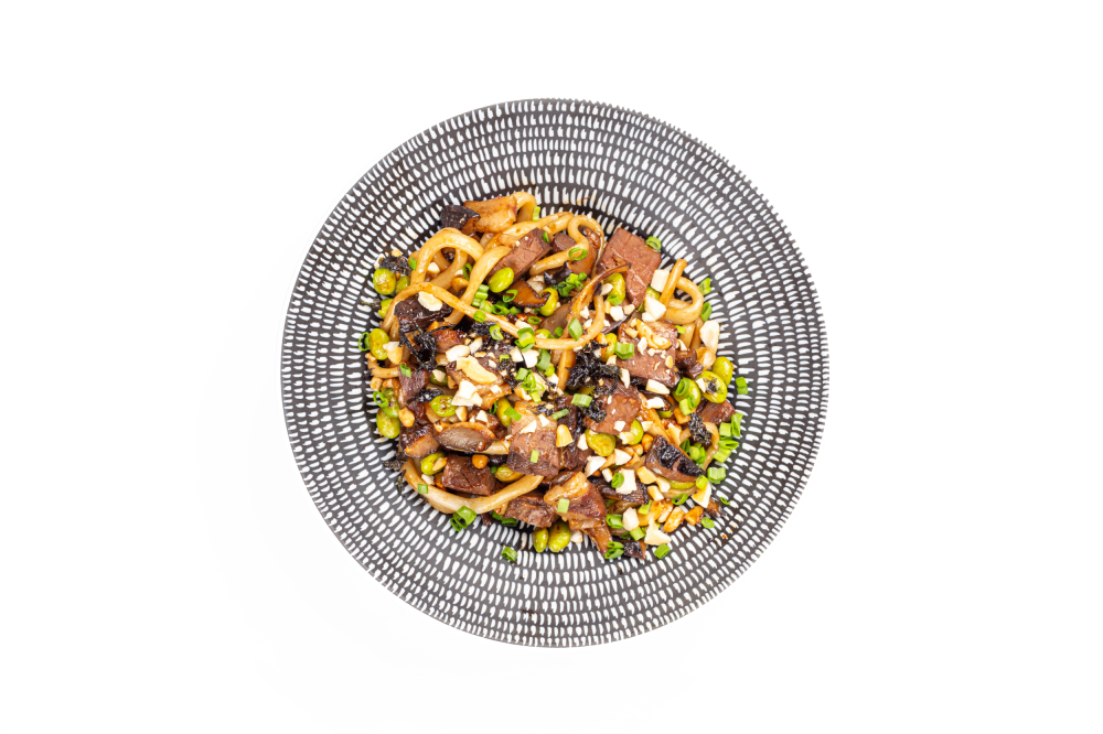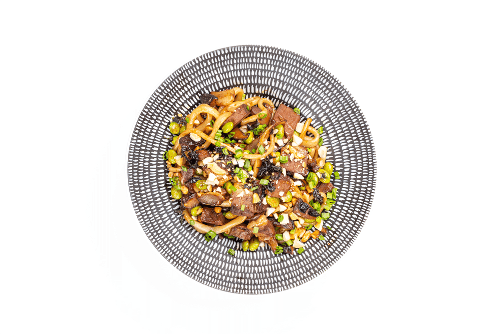 Лапша удон, грибы вешенки, грибы шиитаке, имбирь, чеснок , бобы эдамаме, томленая говяжья грудинка, соус барбекю с тмином, хлопья нори, орехи кешью, зеленый лук , красный перец