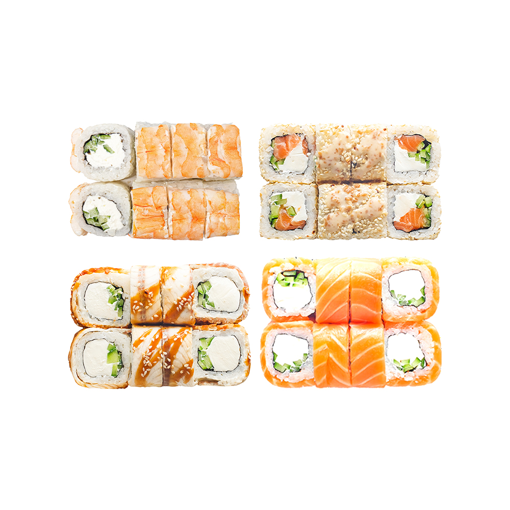 *Только на доставку и самовывоз Фила с креветкой,Аляска ролл,Фила с огурцом ,Канада ролл 4 соевых соуса.2 васаби,2 имбиря