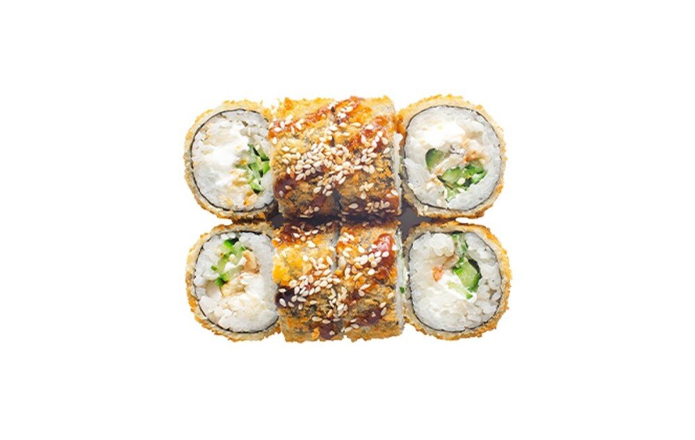 рис, копченый угорь, огурец, сыр cremette, кляр и сухари панко (1 порция = 8 шт)