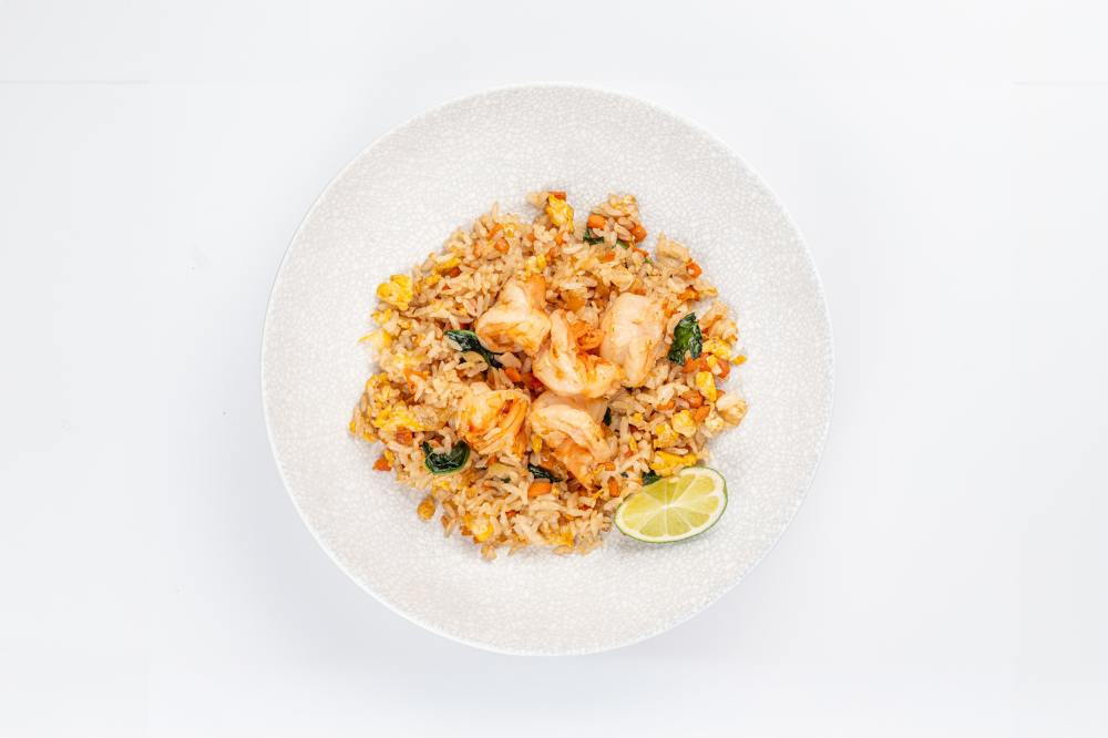Рис, омлет тамаго, морковь, томаты, креветки тигровые