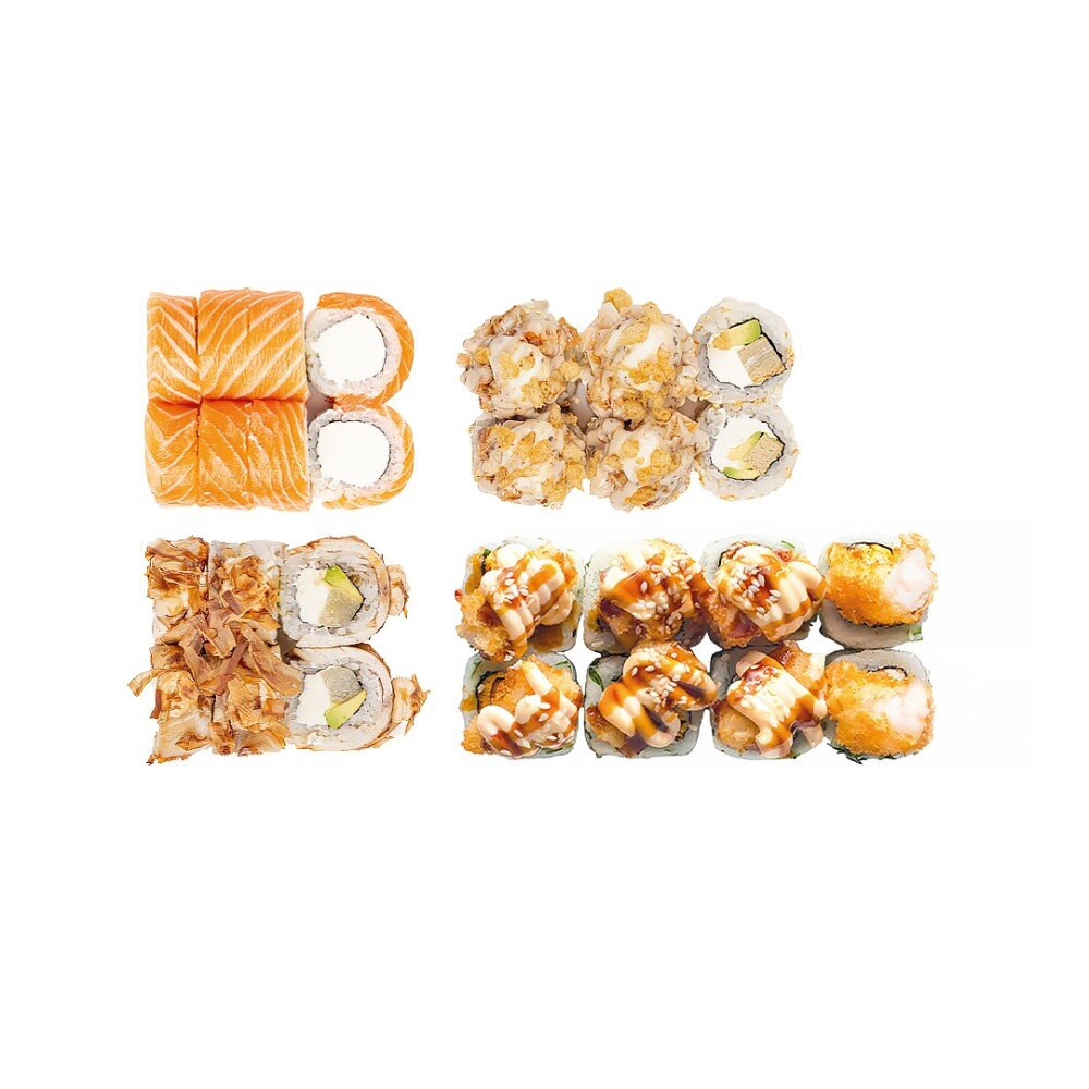 ролл угорь-груша-бонито, ролл запеченый угорь креветкой, ролл киллер, филадельфия классическая - 26 шт