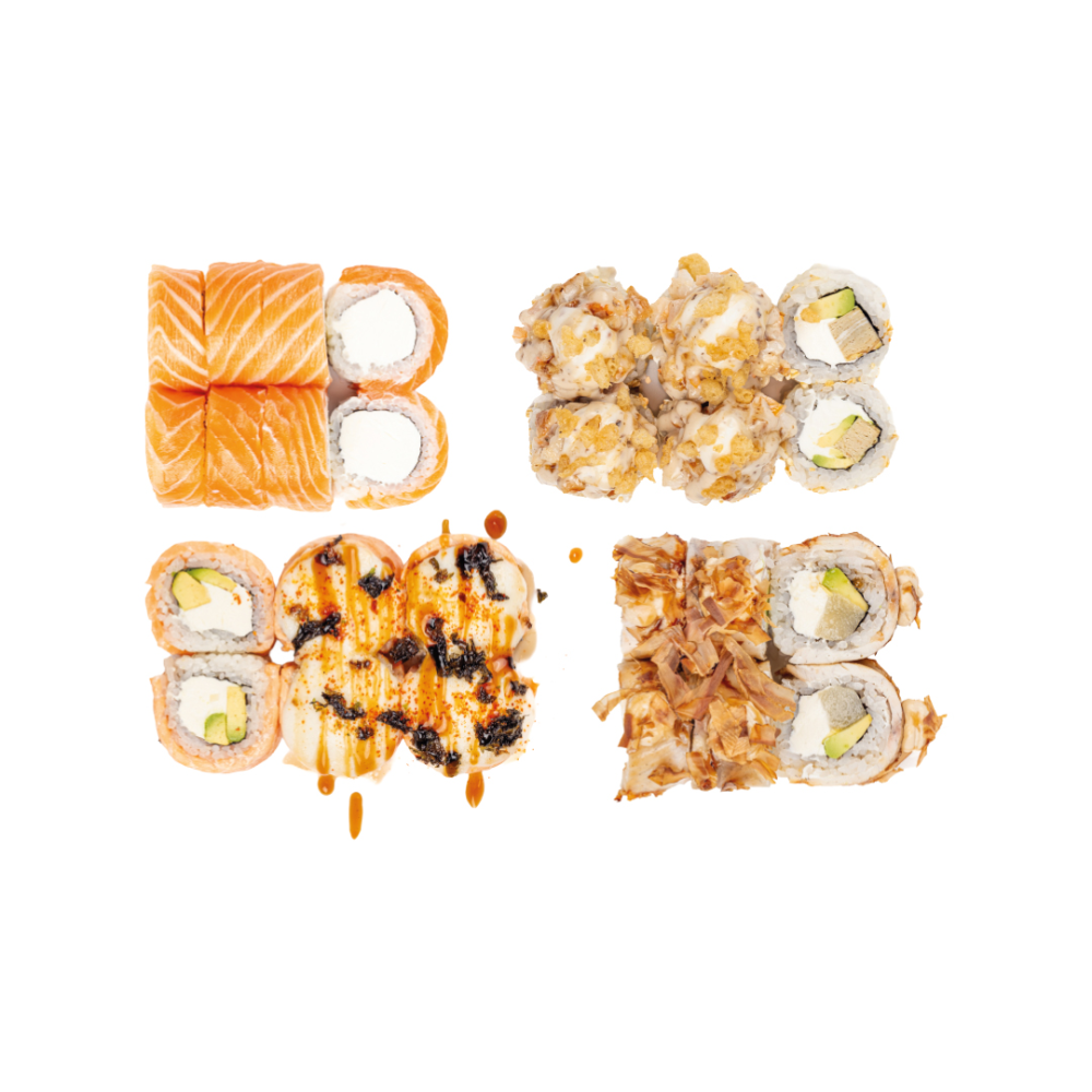 Ролл угорь-груша-бонито, ролл запеченый угорь креветкой, ролл опаленная филадельфия, филадельфия классическая - 26 шт