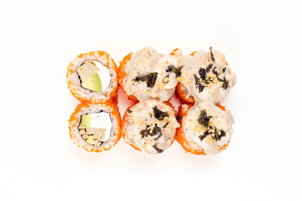 Рис, нори, сливочный сыр, омлет Тамаго, авокадо, икра тобико, лосось, гребешок, трюфельный айоли, айоли пармезан, соус трюфельный майо, соус унаги, хлопья нори