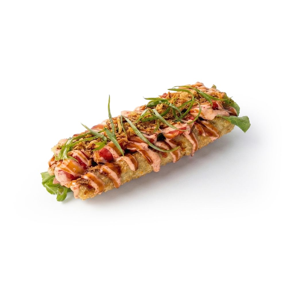 нори, сыр креметта, огурцы, рис, сухари панировочные, лук жареный, спайси, унаги соус, зеленый лук, курица