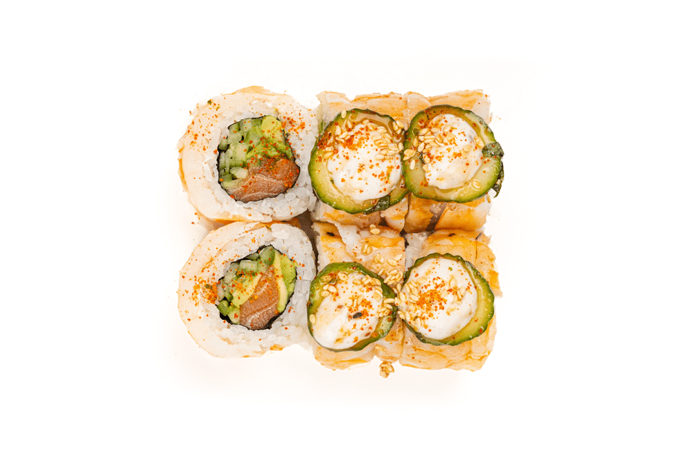 Рис, нори, лосось, огурец , авокадо, креветки тигровые, унаги чиз, огурцы ким чи, айоли юдзу, соус терияки, кунжут со вкусом, специи шичими (1 порция= 6 шт)