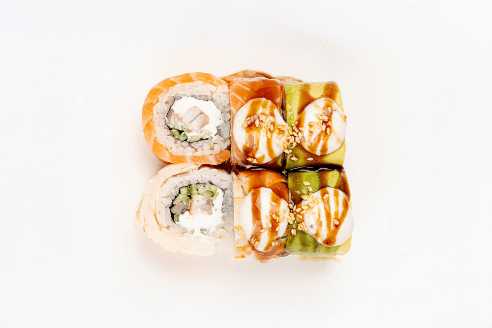 Рис, нори, огурец, сливочный сыр, угорь, креветка тигровая, лосось, авокадо, айоли юдзу, соус терияки, кунжут со вкусом (1 порция= 6 шт)