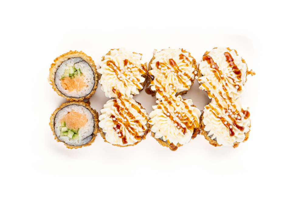 Рис, нори, лосось, огурец , сверху шапка из сыра , поливается унаги соусом и украшается шариками (1 порция = 8 шт.)