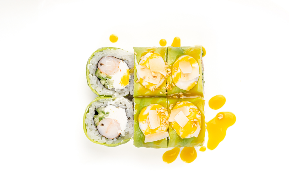 Рис, нори, сливочный сыр, огурец , креветка тигровая, авокадо, айоли юдзу, соус унаги, соус манго юдзу, кунжут, чипсы кокос ( 1 порция = 8 шт.)