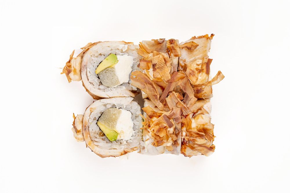 Рис, нори, сливочный сыр, авокадо, груша конфи, филе угря, соус унаги чиз,соус унаги, стружка тунца ( 1 порция = 6 шт.)