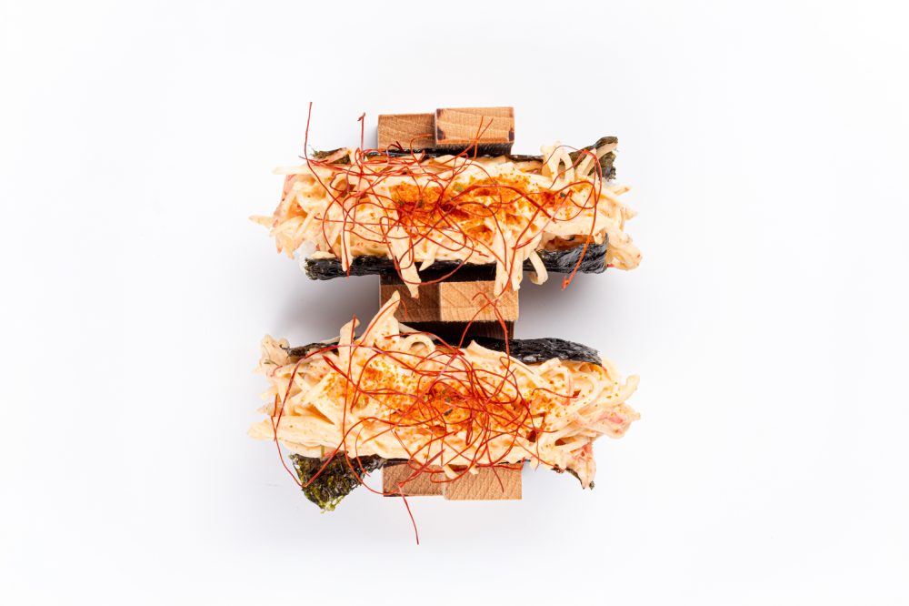 Открытый ролл с крабом в пикантном спайси соусе — яркий вкус, нежная текстура и эффектная подача с лёгкой остринкой. (1 порция = 2 шт )