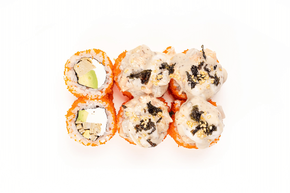 Рис, нори, сливочный сыр, омлет Тамаго, авокадо, икра тобико, лосось, гребешок, трюфельный айоли, айоли пармезан, соус трюфельный майо, соус унаги, хлопья нори (1 порция= 6 шт)