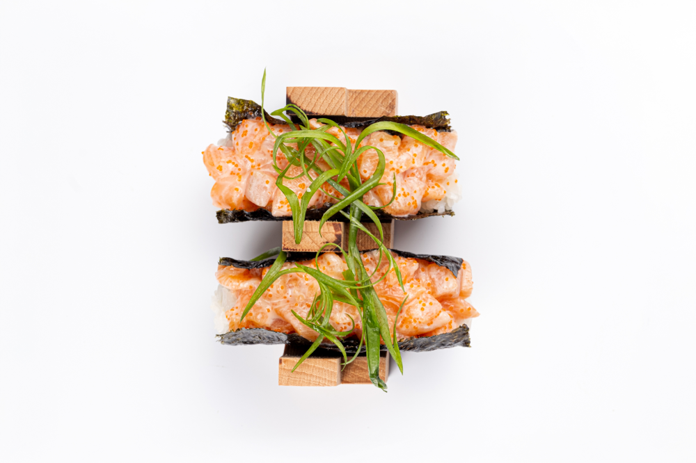 Открытый ролл с лососем в ароматном цитрусовом соусе — сочное сочетание свежести, яркости и легкости в стильной подаче (1 порция = 2 шт )