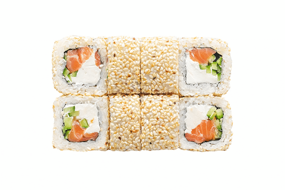 Норвежский лосось,рис, нори, огурец, сыр cremette, кунжут (1 порция = 8 шт.)