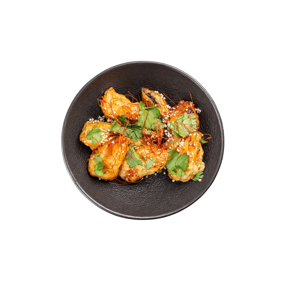 Баклажан,картофельный крахмал, темпура, соус сладкий чили юдзу, воздушный рис, кинза, нити чили
