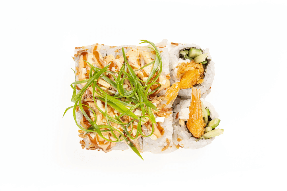 Рис, нори, креветка тигровая темпура, огурец, соус унаги,соус сырный, орех кешью, зеленый лук (1 порция= 8 шт)