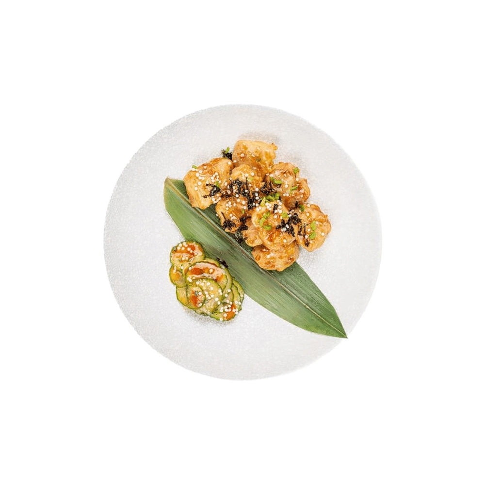 Куриное бедро су вид, картофельный крахмал, соус унаги, лист бамбука, зеленый лук. хлопья нори, кунжут, огурцы ким чи