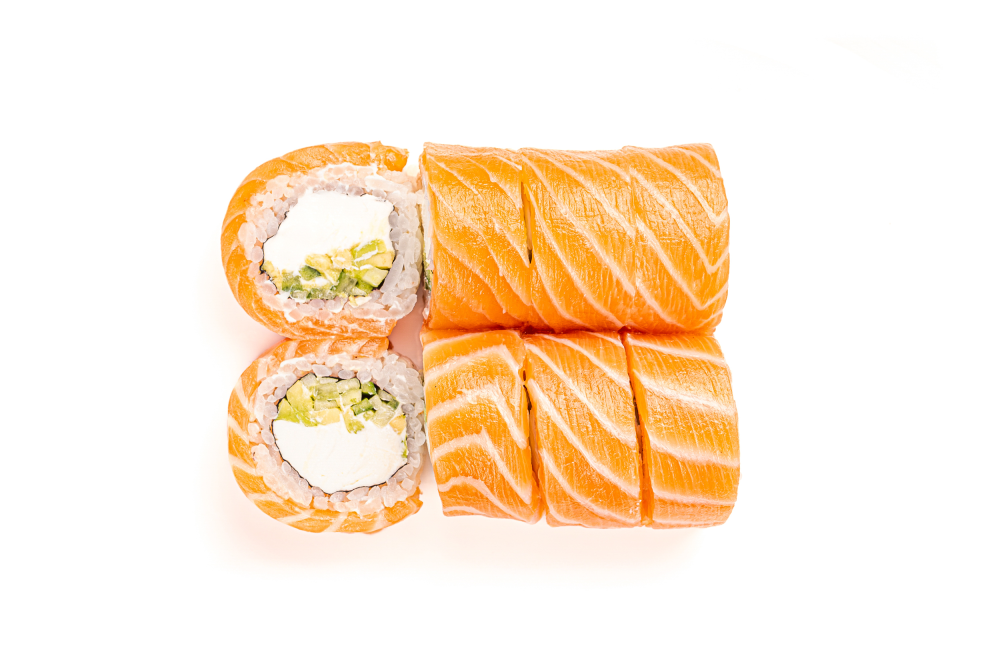 Рис, нори, сливочный сыр, лосось, огурец, кунжут. унаги соус (1 порция = 8 шт.)