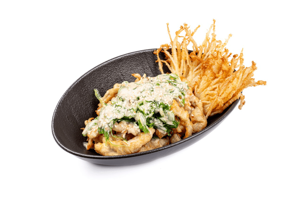 эноки и вешенки в темпуре, салат чука, ореховый соус, кунжут