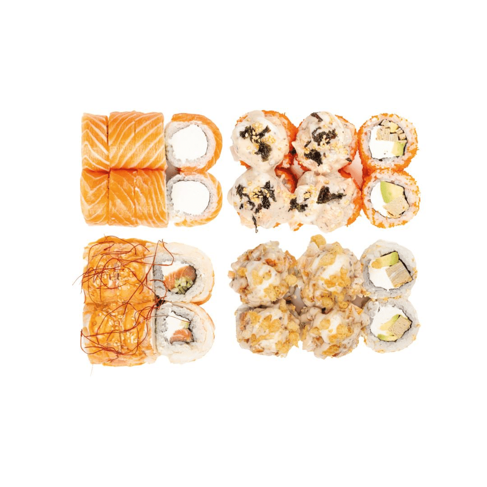 ролл запеченный лосось гребешок, ролл запеченный угорь креветка, ролл том ям, филадельфия - 26 шт