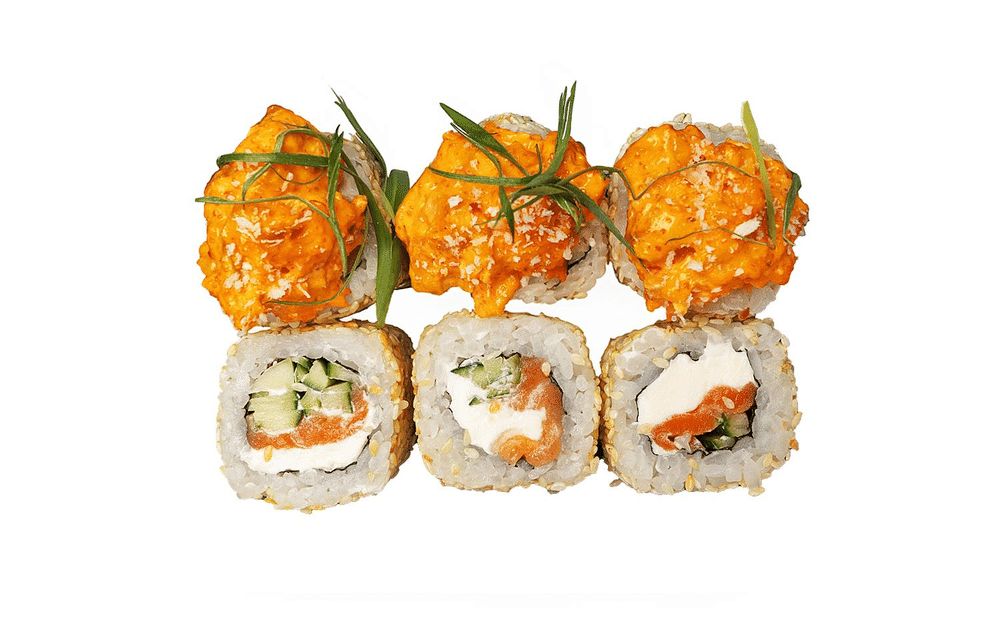 *Только на доставку и самовывоз Норвежский лосось,огурец,сыр cremette,зеленый лук,шапка из угря и спайси соуса, кунжут (1 порция = 6 шт.)