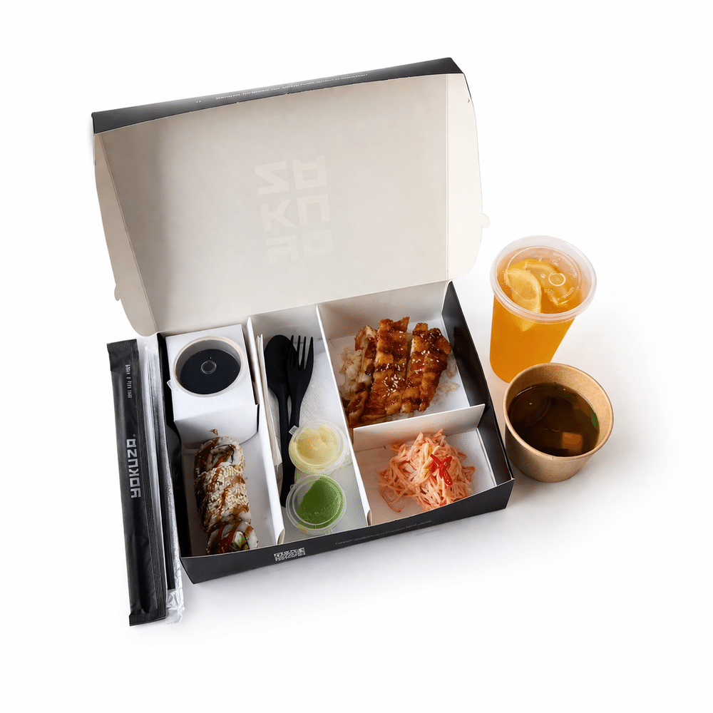 Важно - цена указана с учетом упаковки. Мисо суп, дайкани, курица каццу, ролл с жаренным угрем, напиток на выбор.