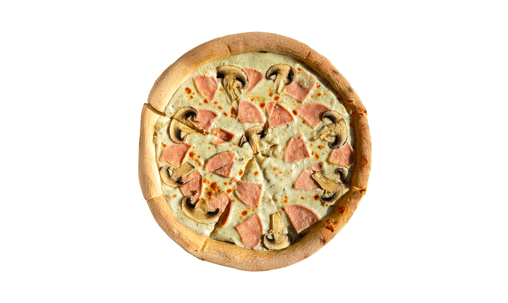 Сыр Моцарелла, шампиньоны, ветчина куриная и фирменнный соус.