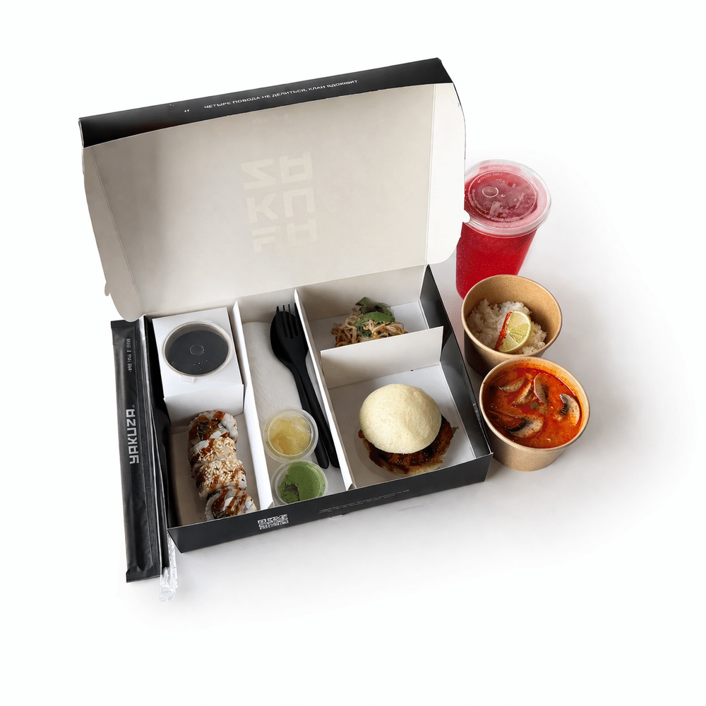 ВАЖНО - цена указана с учетом упаковки. Том ям с курицей,салат эноки,бао бургер,ролл с жаренным угрем,напиток на выбор.