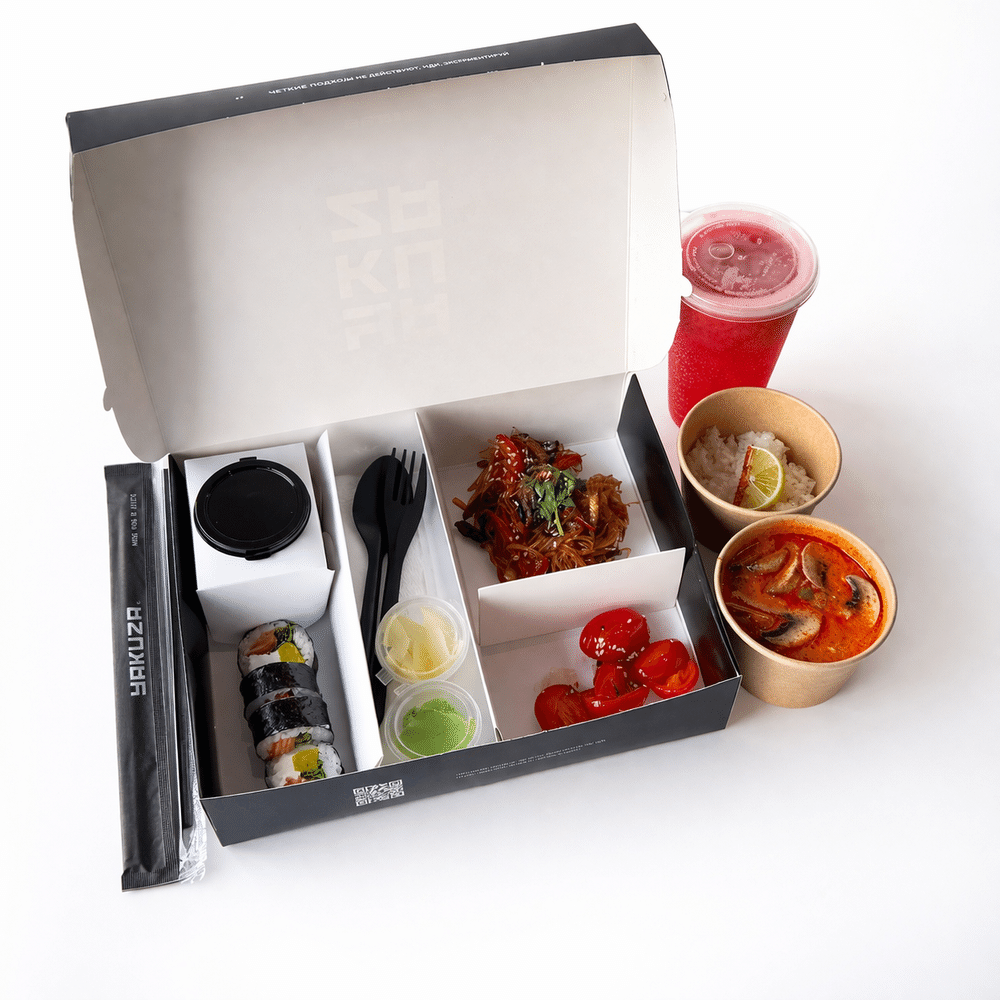 ВАЖНО - цена указана с учетом упаковки. Том ям с курицей,кимчи черри,вок фунчоза,планета маки,напиток на выбор.