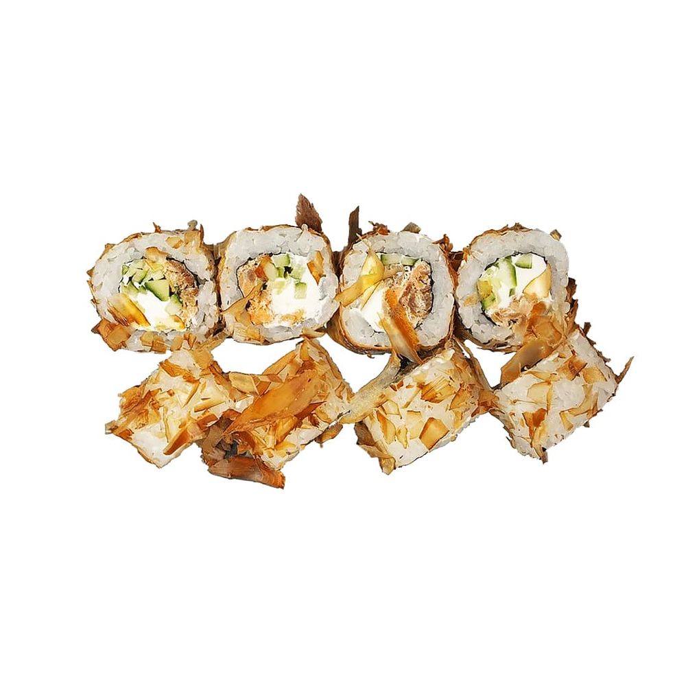 Жаренный норвежский лосось в соусе унаги,сыр cremette ,огурцы,стружка тунца (1 порция=8шт)