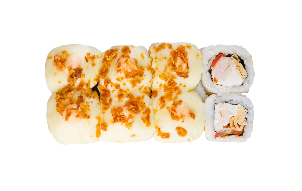 *Только на доставку и самовывоз Копченая курица,помидоры,блин томаго,спайси соус и сырная шапка,жаренный лук (1 порция=8шт)
