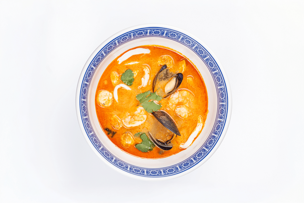 Традиционный тайский суп с ярким, остро-кислым вкусом: насыщенный бульон с нотками лимонной травы, галангала и лайма, с морепродуктами, шампиньонами. Каждый глоток согревающий и бодрящий одновременно.