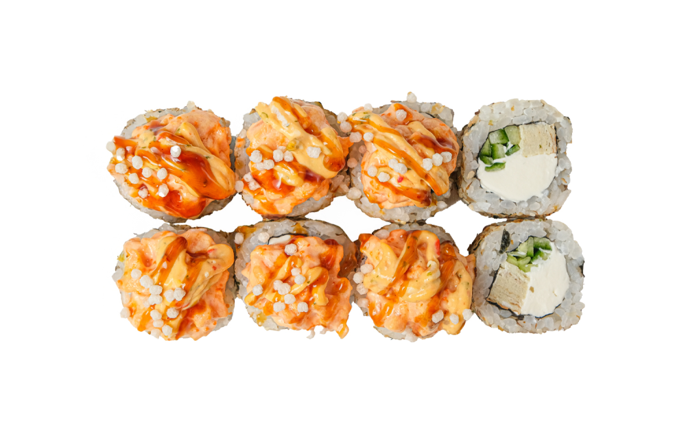 *Только на доставку и самовывоз Норвежский лосось,огурцы,блин томаго,соус шрирача,икра тобико,соус австралийский (1 порция=8шт)