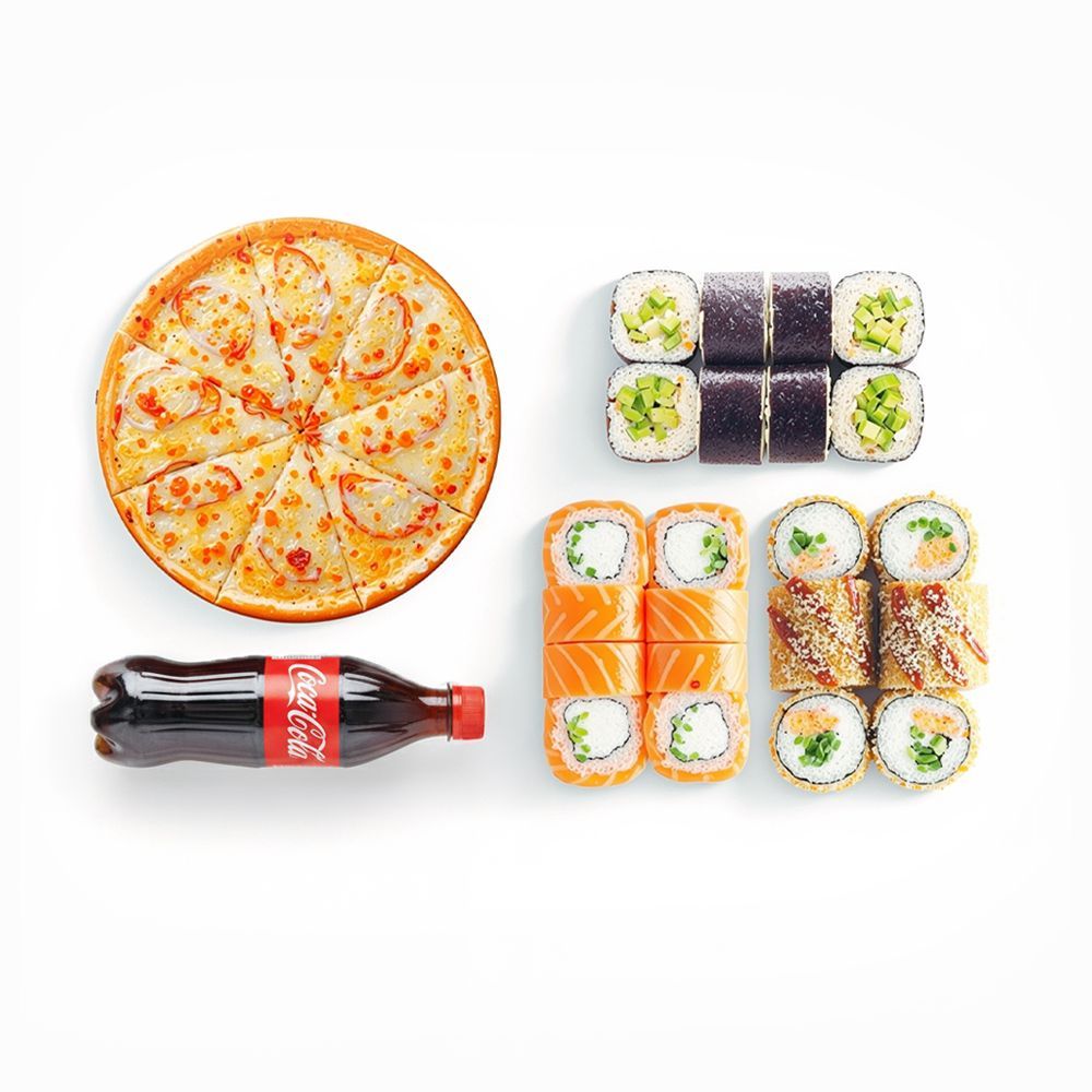 Лосось темпура, Фила с огурцом, Каппа Маки + Пицца "Маргарита" + cola 1л