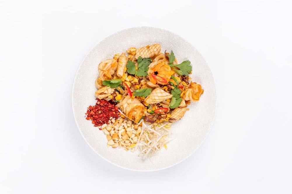 Лапша рисовая, креветки тигровые, кальмары, красный лук, яйцо, соус пад тай. ростки сои, чили хлопья, кешью. украшается кинзай и чили перцем.