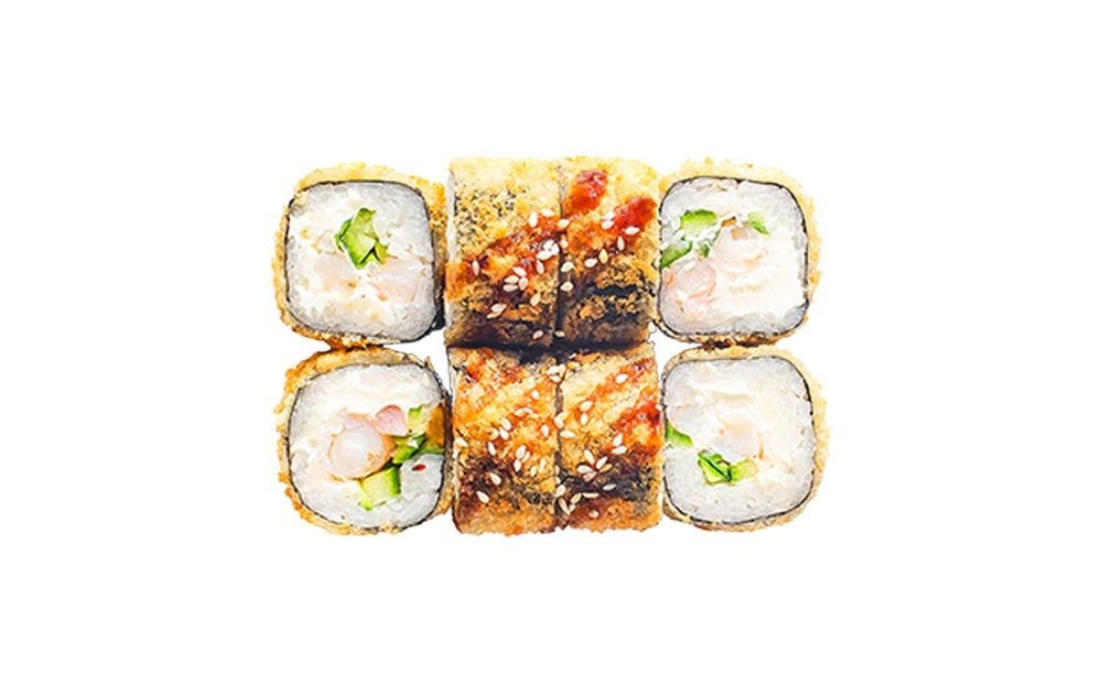 Креветки, сыр cremette, огурец, кляр и сухари панко (1 порция = 8 шт)