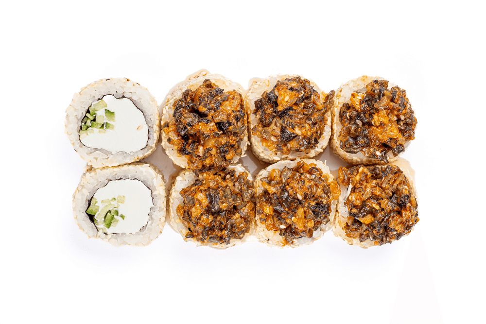 Рис, нори, сливочный сыр, огурец, кунжут , сверху шапка из угря в спайси соусе (1 порция = 8 шт.)